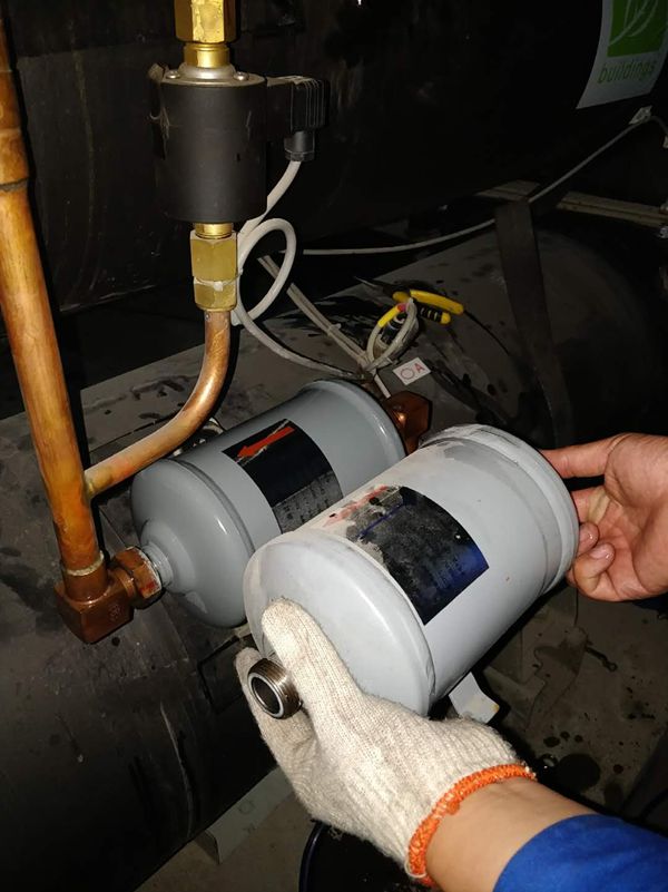 (3)对角松开干燥过滤器端盖的螺丝(松开前要注意温差,防止温差析水带入系统),排空冷媒后迅速将旧的滤芯换下,擦净干燥过滤器筒体内部,换新滤芯,筒体埠加少许冷冻 油加以密封;